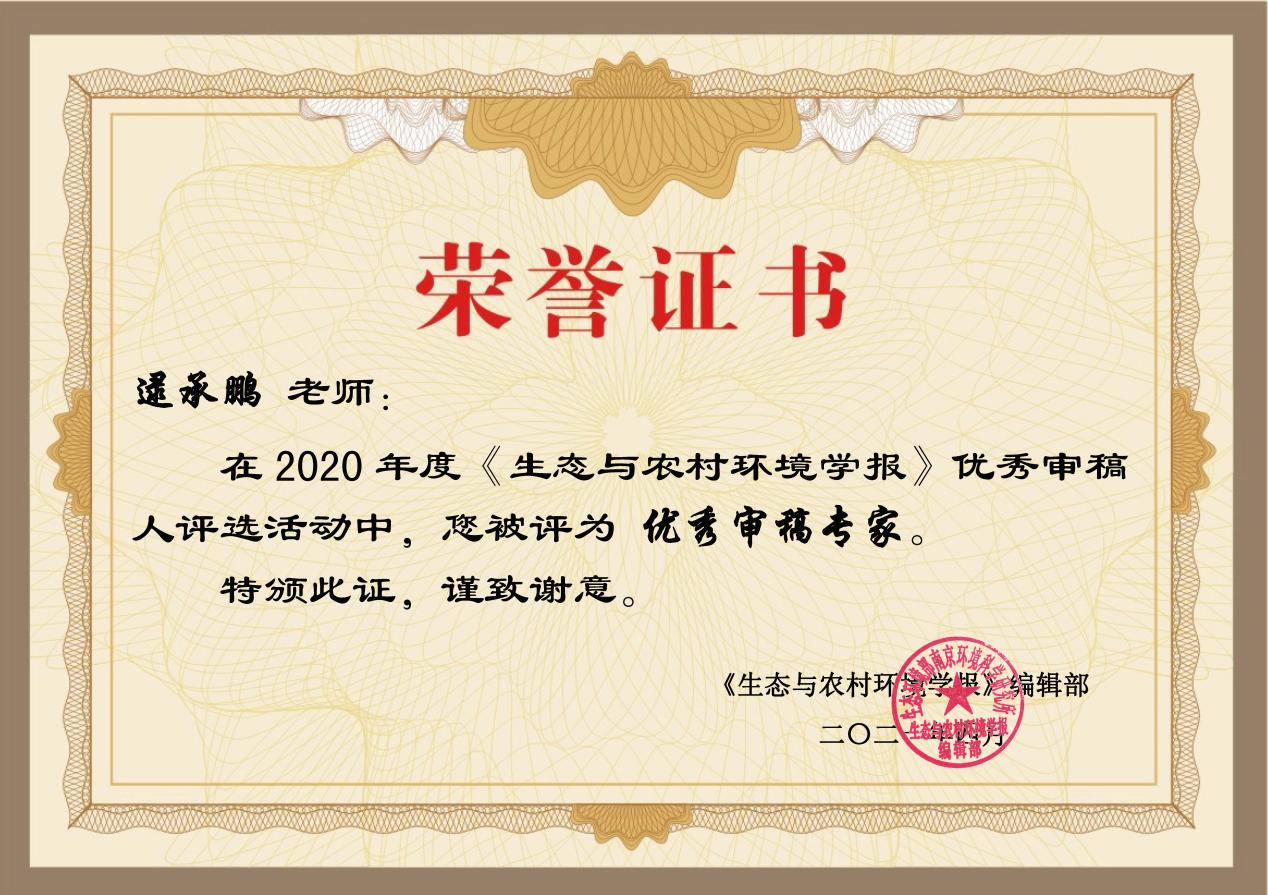 Recently, Lu Chengpeng, young researcher of the institute, was awarded as "Excellent Reviewer" in the 2020 selection of outstanding reviewers hosted by Journal of Ecology and Rural Environment.